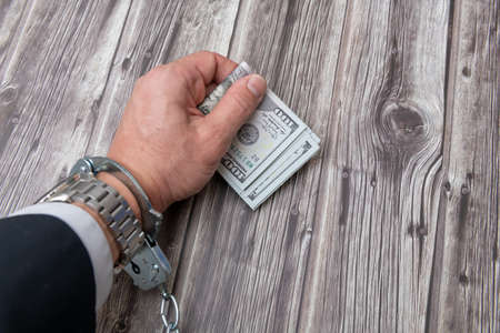 A man's hand in handcuffs and US dollars banknotes on wooden table. Corruption or economic crime concept.