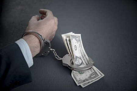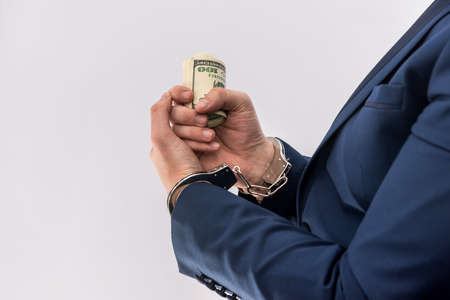 Bribe and corruption areest man who hold dollar in hand cuff, isolated. Crime