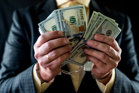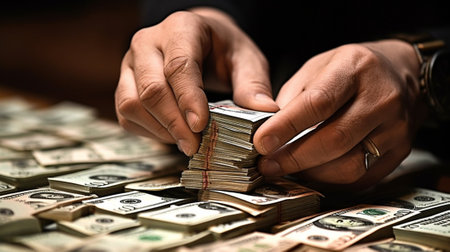 Hands holding a thick bundle of dollar bills, representing wealth, finance, and monetary success.