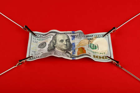 Close up one hundred US dollar paper currency banknote pulled and stretched over red background with copy space, high angle view