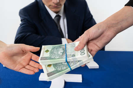 A man businessman in a suit refuses of money that is held in the hands of a person offering a bribe. Concept of bribery and corruption