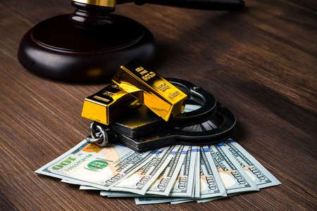 Judge's gavel with dollars and gold, judge's hammer and gold, concept of financial regulation in the price of gold
