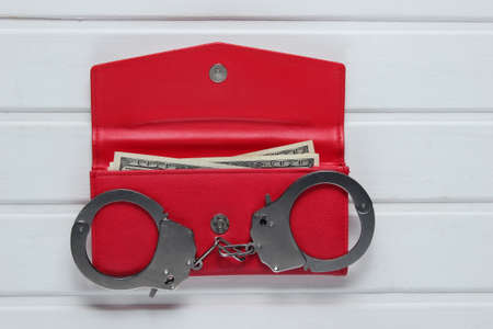 Steel handcuffs with red leather wallet on white table. Theft, criminal concept.