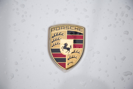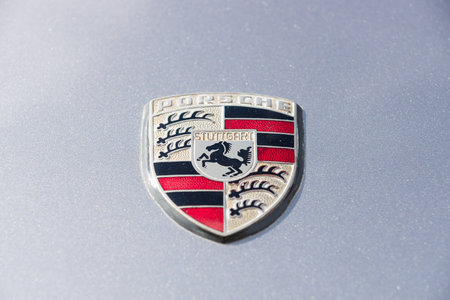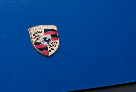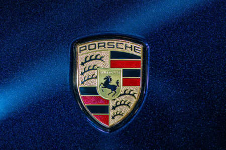 Moscow, Russia - September 10, 2016: Porsche sign on the blue car hood