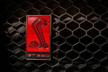 Las Vegas, Nevada, US October 15, 2019 - Red metal Shelby logo on front of a Shelby GT350