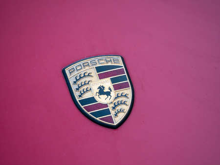 BERLIN, GERMANY - JUNE 1, 2019: The Logo of Porsche On A Purple Car