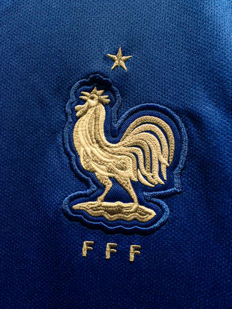 Odder, Denmark - March 26, 2018: Emblem of the french national football team on a shirt