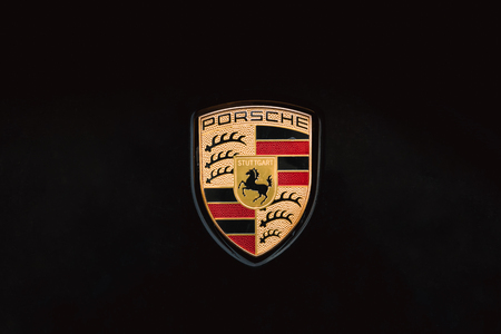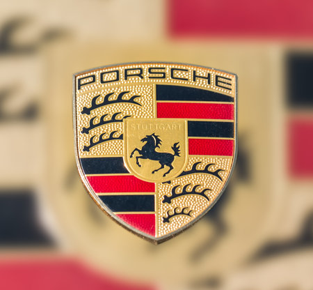 Bucharest, Romania - 05.20.2022: Detailed logo of the German high-performance automobile manufacturer Porsche AG