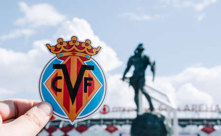 June 14, 2021 Villarreal, Spain. The emblem of the football club Villarreal CF against the background of a modern stadium.
