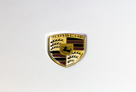 CSTUTTGART GERMANY - JUNE 08, 2016: Close up logo of Porsche sign in Lucerne Switzerland on June 08, 2016 Porsche founded the company in 1931.