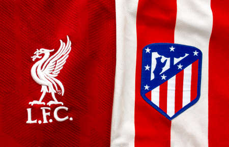 Shield on the shirt of Liverpool Football Club. Uefa champions league final concept on May 28, 2022, champion, europe, premiere league, reds.