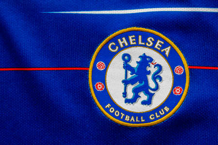 Calgary, Alberta, Canada. July 10, 2020. Chelsea Football Club close up to their logo on a jersey.