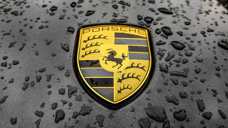 Ukraine, Kiev - March 27, 2020: Porsche logo close up on a black car with raindrops. Hood emblem of a sports car. copy space, editorial photography. German car exhibition on the street