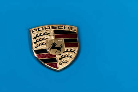 Riga, Latvia, Sep 24, 2021: view of Porsche company logo on the hood of the blue car, closeup