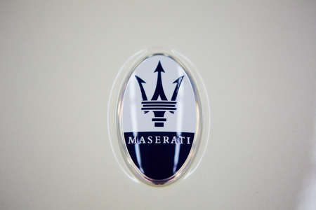 Ukraine, Kyiv - October 10, 2021: Close up logo Maserati. Presentation of new models Maserati