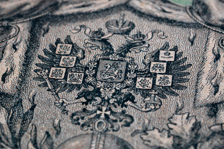 Russian empire coat of arms on banknote close up, uncirculated paper money