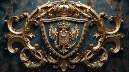 Typical medieval coat of arms with gilded crossed blades and golden shield in 3D