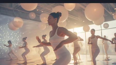 Soft dreamlike shapes of bodies in motion create a beautiful and ethereal background for the intense workout happening in the foreground of this Power Pilates class.