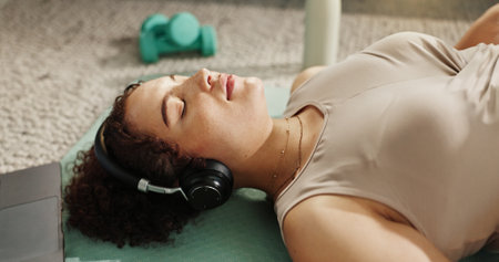 Music, woman and relax on floor for yoga, wellness or self affirmation audio for positive mental health. Girl, headphones or pilates in home with training podcast, streaming radio or laptop in lounge