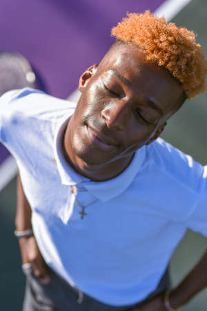 Teenager with closed eyes under neon light