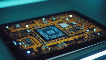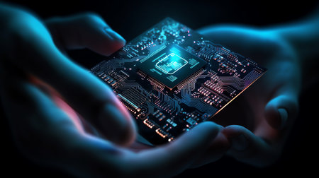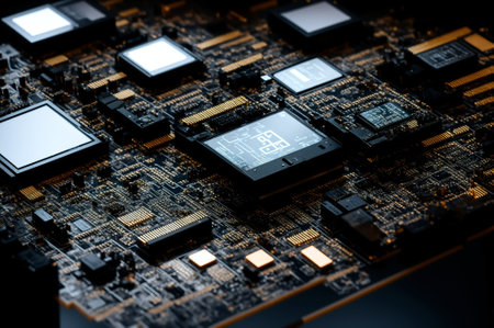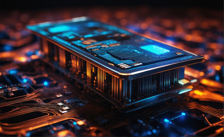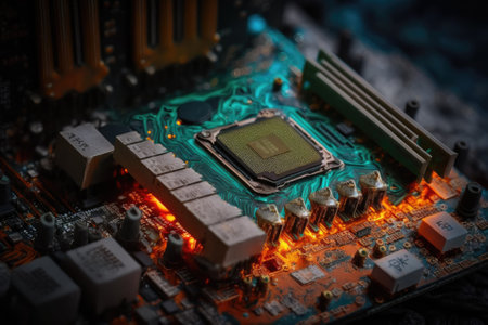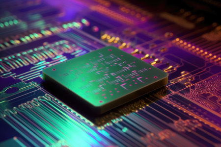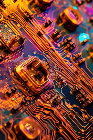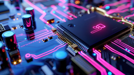 Close-up image of a futuristic circuit board featuring vibrant neon lights and a detailed microchip, showcasing advanced technology and electronic design.