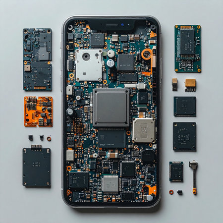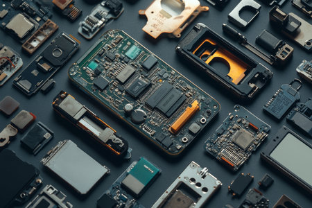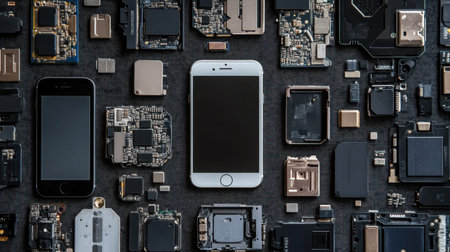 Showcasing intricate smartphone components displayed on a flat surface for technology enthusiasts