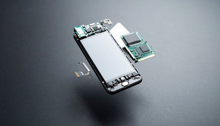 A modern smartphone levitates in a deconstructed state, revealing the intricate complexity of its internal components.