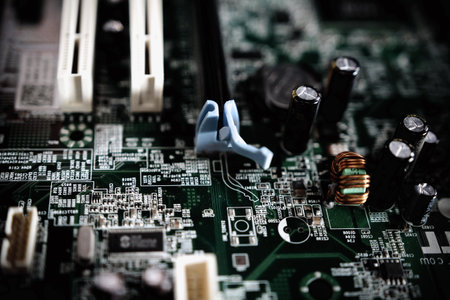 Electronic components close-up on an old computer motherboard. Dust on the surface of the parts. Selective focus