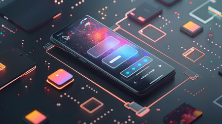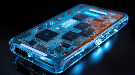Hand holding illuminated smart phone, close up of touch screen technology generated by artificial intelligence