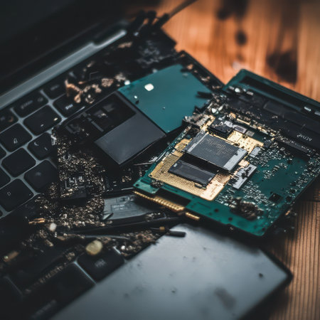 A disassembled laptop is placed on a wooden surface revealing the intricate circuit board alongside scattered components and tools.