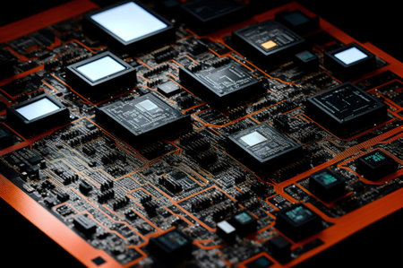 A close up of a computer chip with many small black and orange squares. Concept of complexity and complexity, as the many components small work together to create a larger system