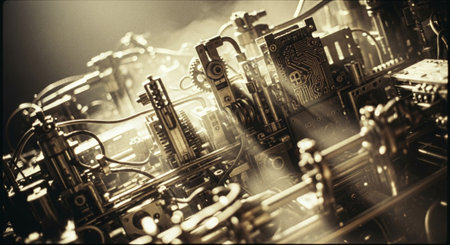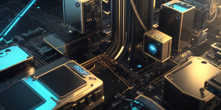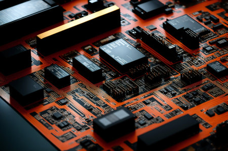 Closeup of electronic hardware. assembly on the circuit board with dark red and blue reflection, conceptual creative association