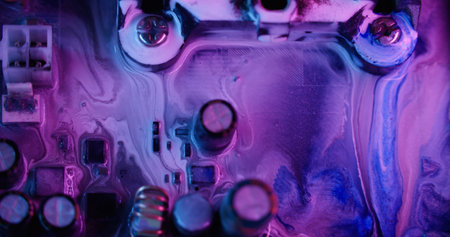 Paint spill. Circuit board. Defocused purple blue neon color vibrant microchip round texture bolt water on abstract electronic art background.