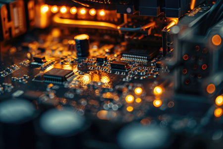 A close-up view of an intricate circuit board featuring various electronic components and illuminated connections, ideal for tech projects and innovation themes.