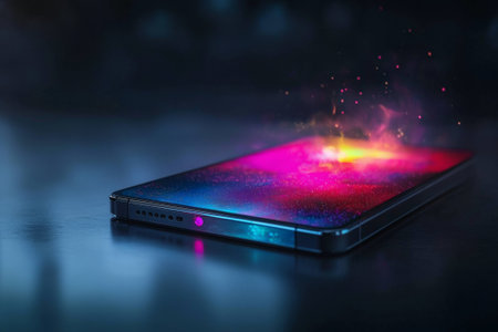 A sleek smartphone rests on a dark surface, emitting vibrant colors and ethereal sparks. The glowing display radiates hues of pink and blue, creating a captivating visual effect.