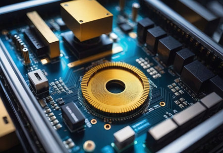 A detailed view of electronic components on a circuit board, illuminated by vibrant bokeh lights that evoke innovation and technological brilliance.