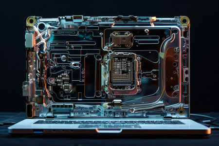Macro View of Laptop Internal Components and PCB with Green and Blue Futuristic Accent Lighting