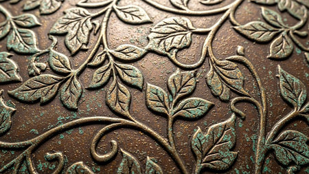 Close-up of aged bronze metal with an embossed floral vine pattern and a green verdigris patina.