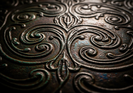 This captivating close-up showcases an intricate floral design on an antique metal surface. The elegance and detail highlight expert craftsmanship, perfect for artistic projects.