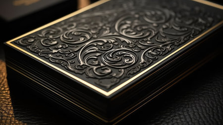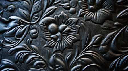 Black tooled leather background with intricate floral patterns, intricately carved and detailed designs, showcasing the artistry of handcrafted textures. --chaos 30 --ar 16:9 --v 6.1 Job ID: b5ef4f62-0a09-46f9-bfb9-51868e0cf853