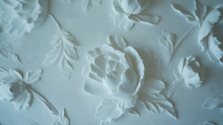 This image showcases a stunning white floral pattern embossed on a wall, creating a visually appealing texture. The intricate design features a variety of flowers and leaves, adding an element of elegance to the surface. The subtle shading and embossing give the pattern a sense of depth and sophistication, making it suitable for decorative purposes.