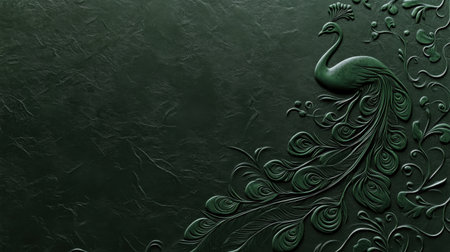 A stunning embossed peacock design on a dark green leather background showcases intricate detailing and textures, perfect for luxury d