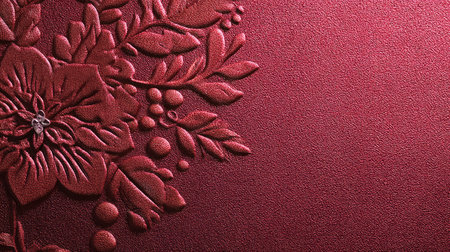 This captivating image features an elegant embossed floral design in deep burgundy, showcasing graceful petals and leaves on a textured background. Ideal for art and decor themes.