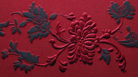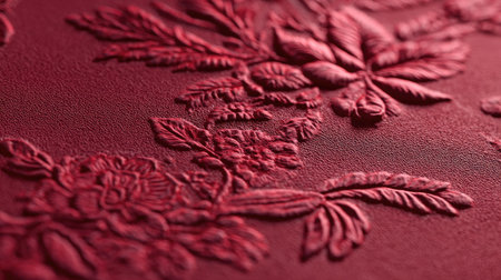 This striking deep red embossed background features elegant floral designs, providing a textured and aesthetically pleasing surface perfect for various creative projects.