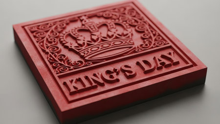 Red King's Day stamp with crown, royal emblem, ornate border
