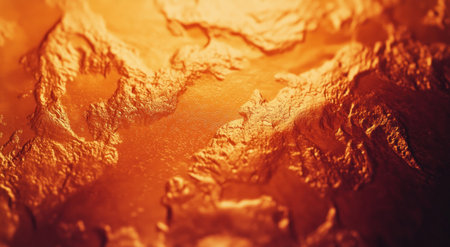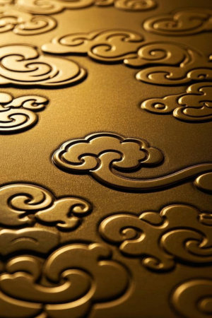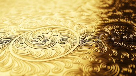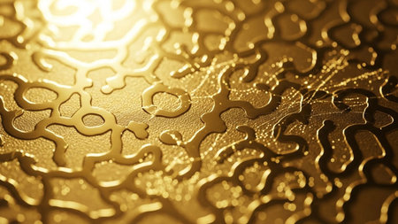 A close-up, macro view of a golden surface reveals an intricate, abstract pattern of swirling lines and organic shapes. The metallic texture is highly reflective, with bright highlights and deep shadows that emphasize the embossed or relief-like The warm, glowing tones and shimmering evoke a sense of luxury and elegance, making it as a decorative background or artistic