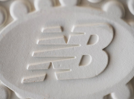 Close-up of the New Balance logo on the sole of the sneaker. New Balance is the world's largest manufacturer of athletic footwear.