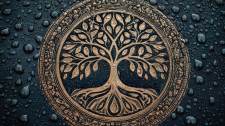 Old metal plate with a pattern of a tree on a dark background.