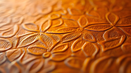 Floral engravings rise from warm orange leather, highlighting fine artistry and craftsmanship.