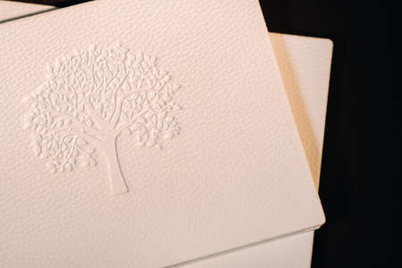 Composition of photo books in natural white leather of different sizes. The white paper on a dark background